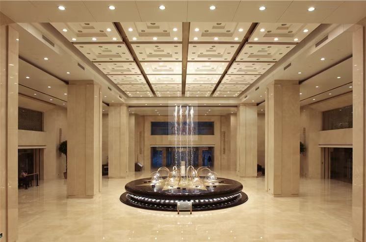 大堂及公共部分:地面、墙面选用特级西班牙米黄大理石铺装、墙面装饰大型镀金浮雕、进口宝盾超大两翼旋转门 。